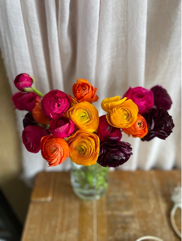 I used locally grown spring flowers anemone and ranunculus with the addition of some soft
